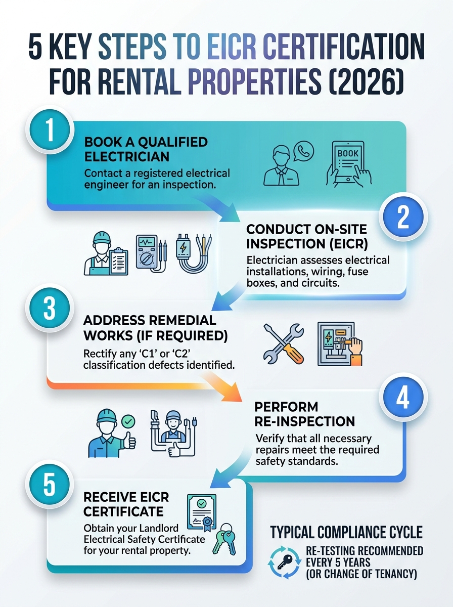 A visual guide showing the five steps to EICR certification for rental properties in 2026. Perfect for landlords aiming for compliant electrical safety certificates.