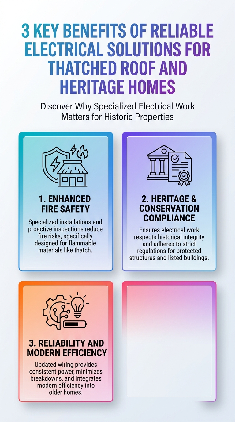 Three essential benefits of reliable electrical solutions for thatched roofs and heritage homes. This infographic highlights safety, compatibility, and energy efficiency.